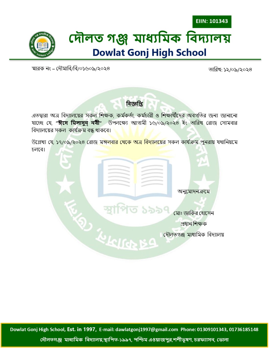 ঈদ-ই-মিলাদুন নবী উপলক্ষ্যে বন্ধের নোটিশ